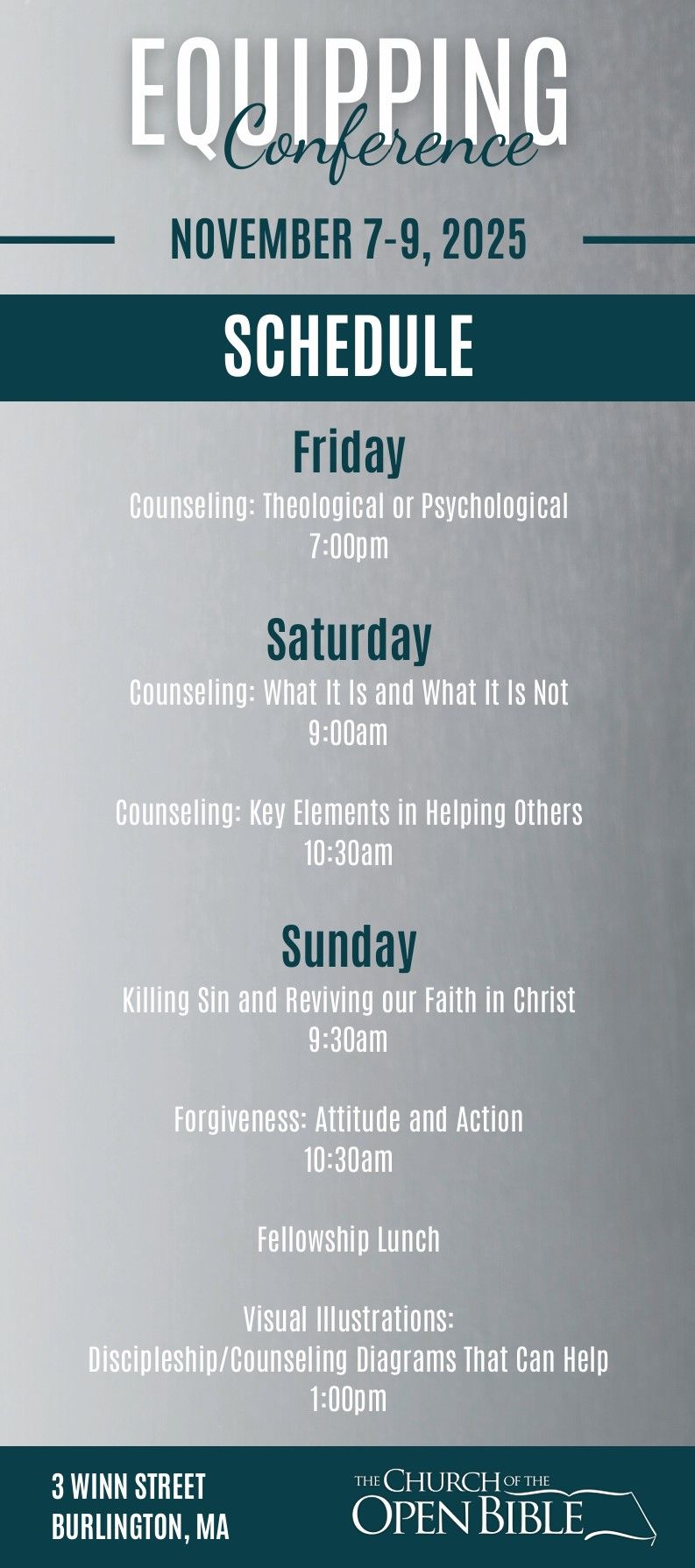 Annually we host a mini-conference designed to equip our people to live out the Gospel in our world. We bring conference speakers who are gifted communicators on their subject and will skillfully and faithfully help us understand and apply scripture in our lives and context.